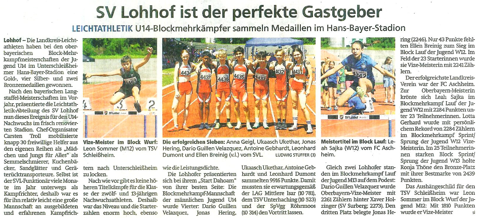 Die diesjährigen Oberbayerischen Block-Mehrkampfmeisterschaften der Altersklasse U14 fanden am 19.07.2025 bei uns in Unterschleißheim statt. Bei strahlendem Sonnenschein bestritten sieben der jungen Athletinnen und Athleten des SV Lohhofs einen Mehrkampf.